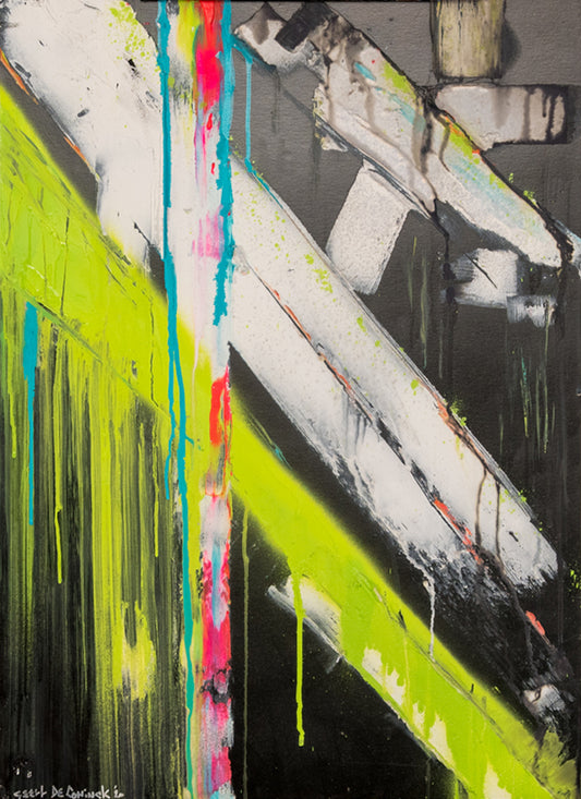 Geert De Coninck is a multidisciplinary creative who blends street art techniques with both digital and traditional media. Influenced by expressionism, his work features layered, playful details and mysterious asemic writing — drawing inspiration from myths and the idea of a deeper, unseen universe.